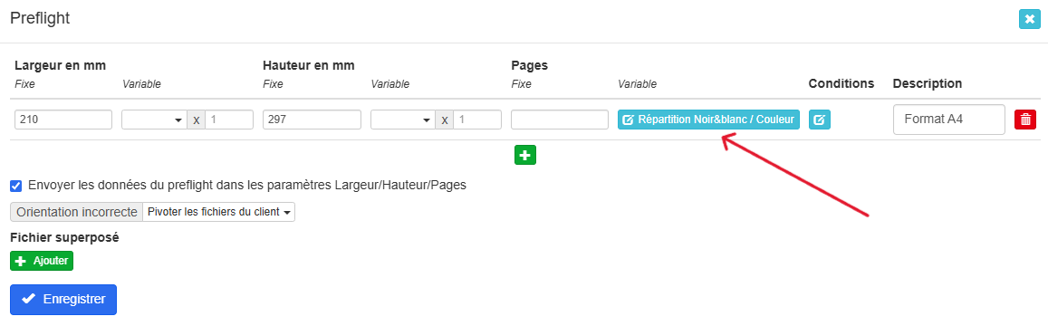 Jusqu’à présent, il était déjà possible de transmettre les données des fichiers analysés par le preflight vers la fiche produit, notamment pour compter le nombre de pages en combinant un paramètre de type « Valeur numérique » avec la valeur « Pages » issue du preflight, affectée à une variable.