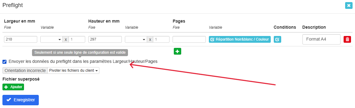 Pour que cela fonctionne, le preflight doit être activé sur la fiche produit, et la case « Envoyer les données du preflight dans les paramètres Largeur/Hauteur/Pages » doit être cochée afin de permettre la transmission des informations.