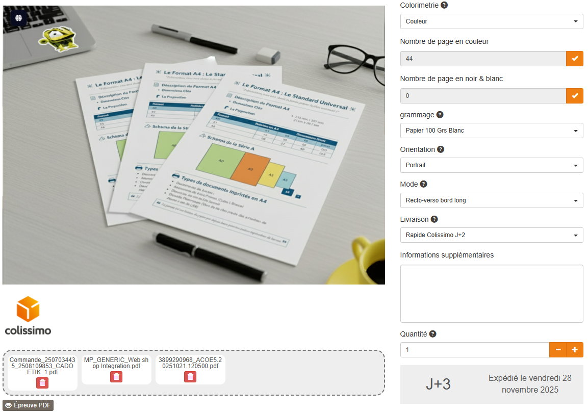 Par ailleurs, le preflight peut analyser la couleur des pages de plusieurs documents simultanément lorsque le client en dépose plusieurs sur la fiche produit.