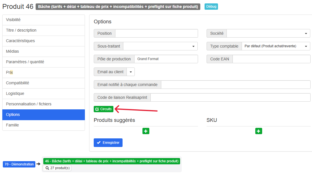 Rendez-vous sur la fiche produit concernée, accédez à l’onglet « Options », puis cliquez sur le bouton « Circuits » pour lier un circuit à l’option ou à la variante souhaitée.
