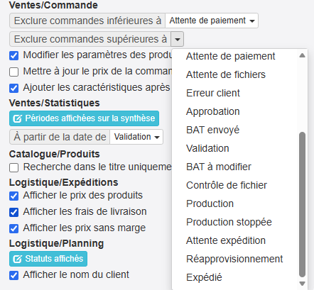 Vous pouvez désormais sélectionner le statut de commande pour lequel vous souhaitez exclure les commandes supérieures à ce statut.