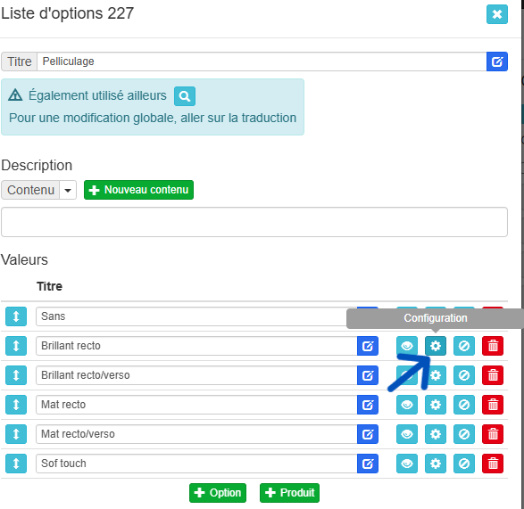 Pour cela, il vous suffira d'aller sur l'onglet paramètres d'un produit et de sélectionner une liste d’options, puis de configurer les caractéristiques souhaités pour chaque option.