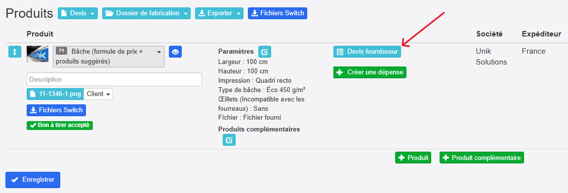 Nous avons développé un nouveau module pour notre solution, qui ajoute sur la fiche commande, pour chaque ligne de produit, un bouton « Devis fournisseurs ».