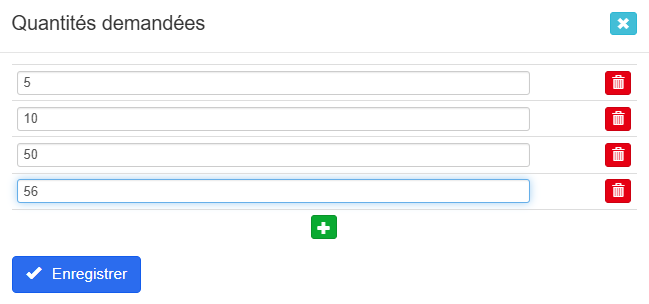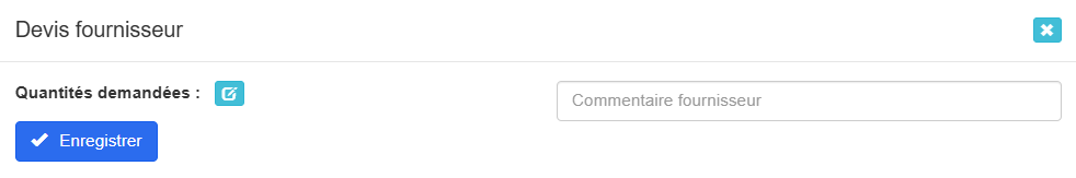 Lorsqu’on clique sur ce bouton, une interface s’ouvre permettant de saisir les quantités pour lesquelles on souhaite obtenir des informations de prix, ainsi qu’un champ commentaire pour ajouter des précisions sur la demande de devis.