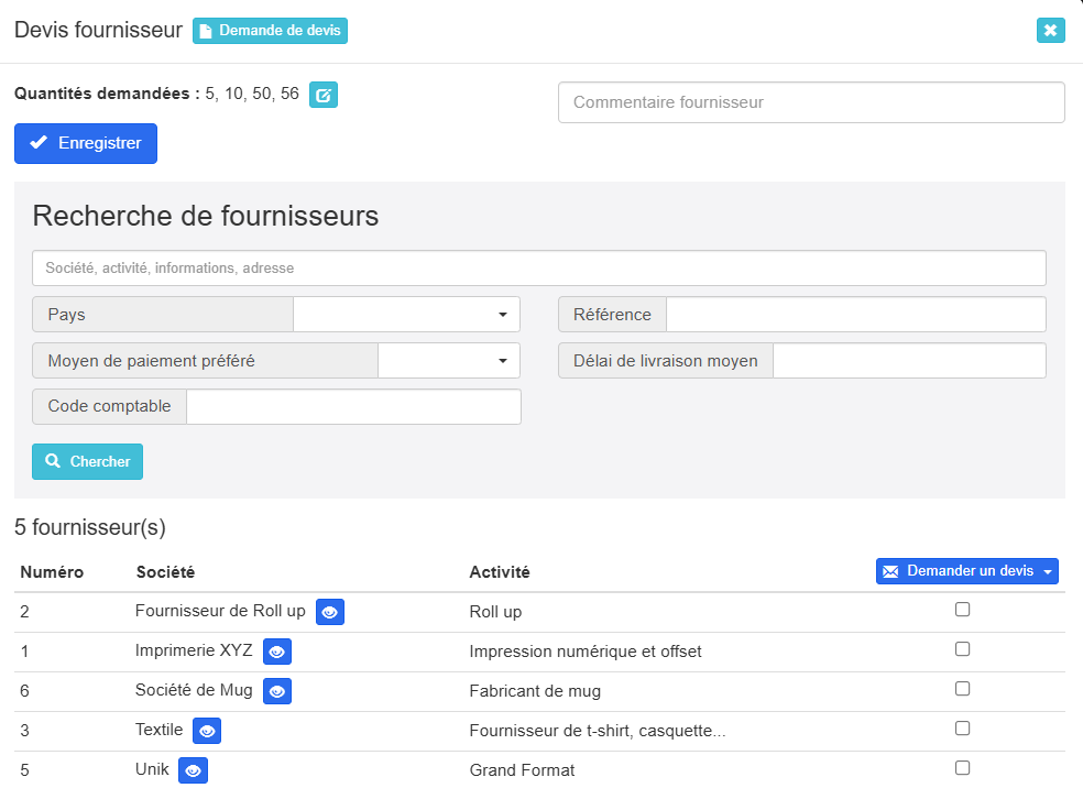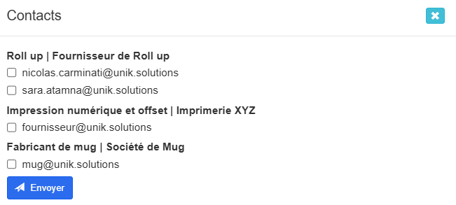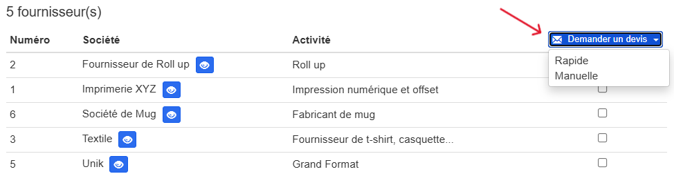 Grâce à une case à cocher en face de chaque fournisseur, vous pouvez choisir à qui envoyer la demande de prix.