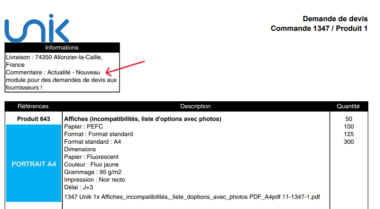 Celui-ci vous permet de contacter directement les fournisseurs que vous aurez préalablement renseignés sur Unik, afin de leur demander leurs tarifs pour une quantité donnée d’un produit. Vous pourrez ainsi comparer les offres, sélectionner la plus avantageuse et intégrer automatiquement les prix retenus dans vos fiches de commande.