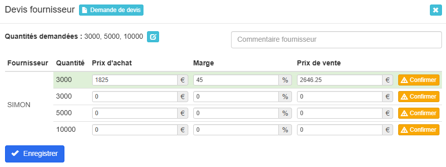 Vous pouvez ensuite renseigner les prix d’achat reçus de chaque fournisseur et indiquer la marge souhaitée.