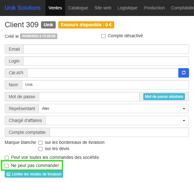 Activable sur demande auprès de notre support, cette option ajoute une case à cocher « Ne peut pas commander » directement sur la fiche client.