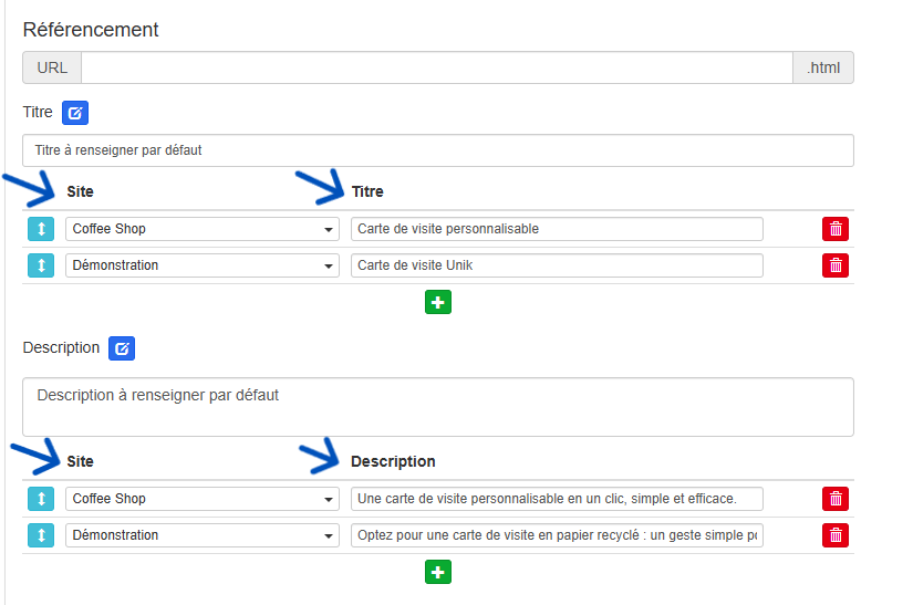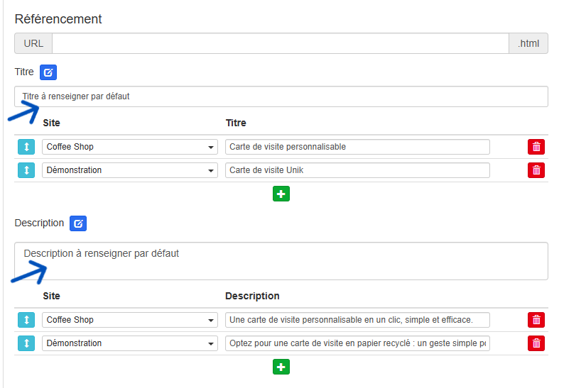 Un bandeau en haut de la section permet également de définir un titre et une description par défaut, utilisés si aucun contenu spécifique n’est renseigné par site.
